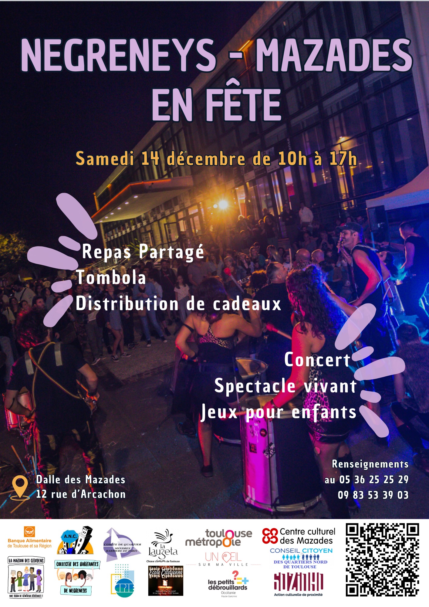 Dalle des Mazades - 14 décembre 2024Venez retrouver la fête de quartier Negreneys – Mazades le 14 décembre 2024 sur la dalle des Mazades !