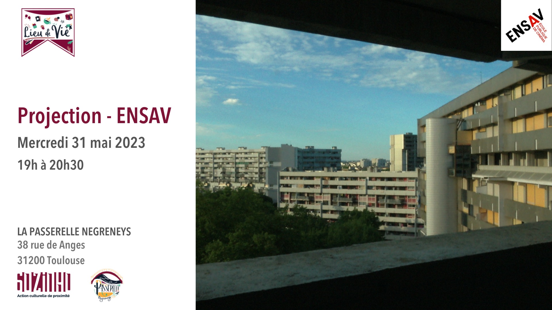 La Passerelle Negreneys - 31 mai 2023Le mercredi 31 mai c’est la projection mensuelle de la passerelle, sauf que cette fois ci c’est en collaboration avec l’ENSAV, l’école publique de cinéma. A partir de 19h venez voir “Prochaine station : Reynerie” de Franck Hourliac, Mathilde Joucla, Justine Servoz, Lena Soilihi-Bastid.
